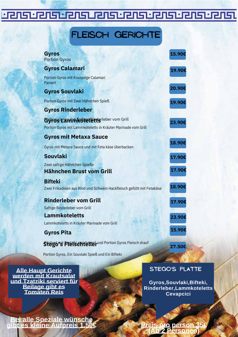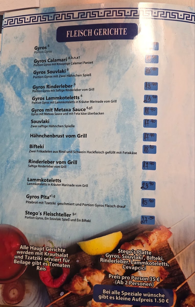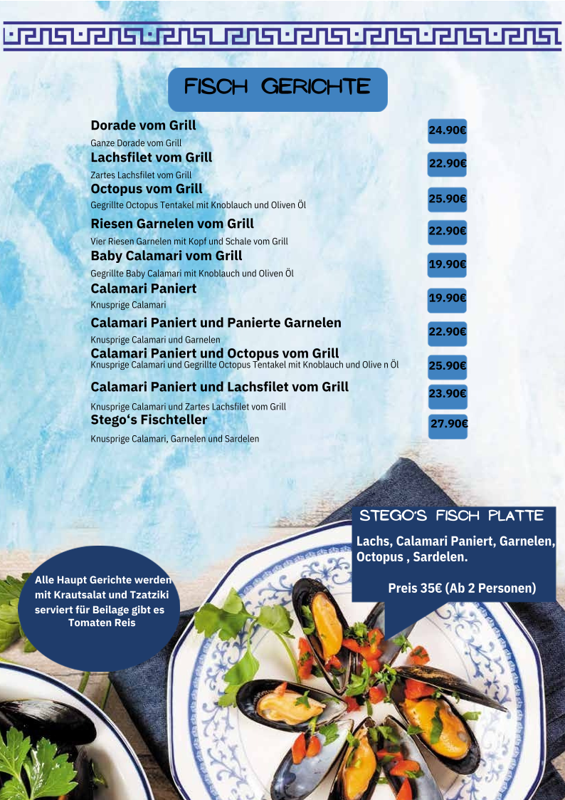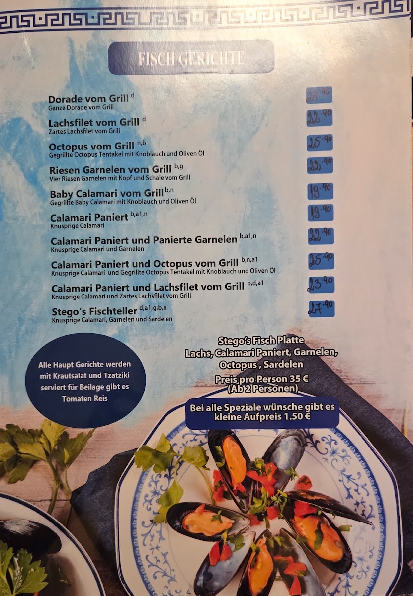 Overall, the menu at Griechische Restaurant Stego’S Füssen offers a satisfying and well-rounded glimpse into traditional Greek cuisine, with a variety of flavorful options across each category. The appetizers stand out with classics like Tzatziki, Garnelen Saganaki, and Oktopus vom Grill, as well as a generous Warme Vorspeise Platte ideal for sharing. Freshness continues in the salads, where choices such as Salat Stego’s, Salat mit Gyros, Salat mit Feta Saganaki, and the ever-popular Griechischer Salat provide lighter yet authentic alternatives. The main meat dishes are particularly appealing, featuring staples like Souvlaki, Bifteki, Gyros, and the richer Gyros mit Metaxa sauce, alongside Rinderleber vom Grill for those seeking something more distinctive. Seafood lovers are also well catered for, with options like Baby Calamari vom Grill, Lachsfilet vom Grill, and Miesmuscheln mit Tomaten Reis, all reflecting a Mediterranean touch. To complement the meal, the inclusion of cocktails such as the refreshing Mojito adds a modern twist. While specific prices are not listed, the selection itself suggests a menu designed to balance tradition, variety, and satisfying portions, leaving a positive final impression.