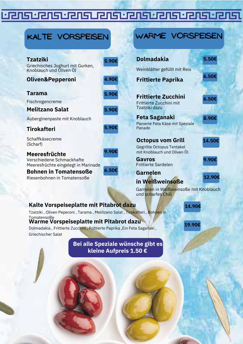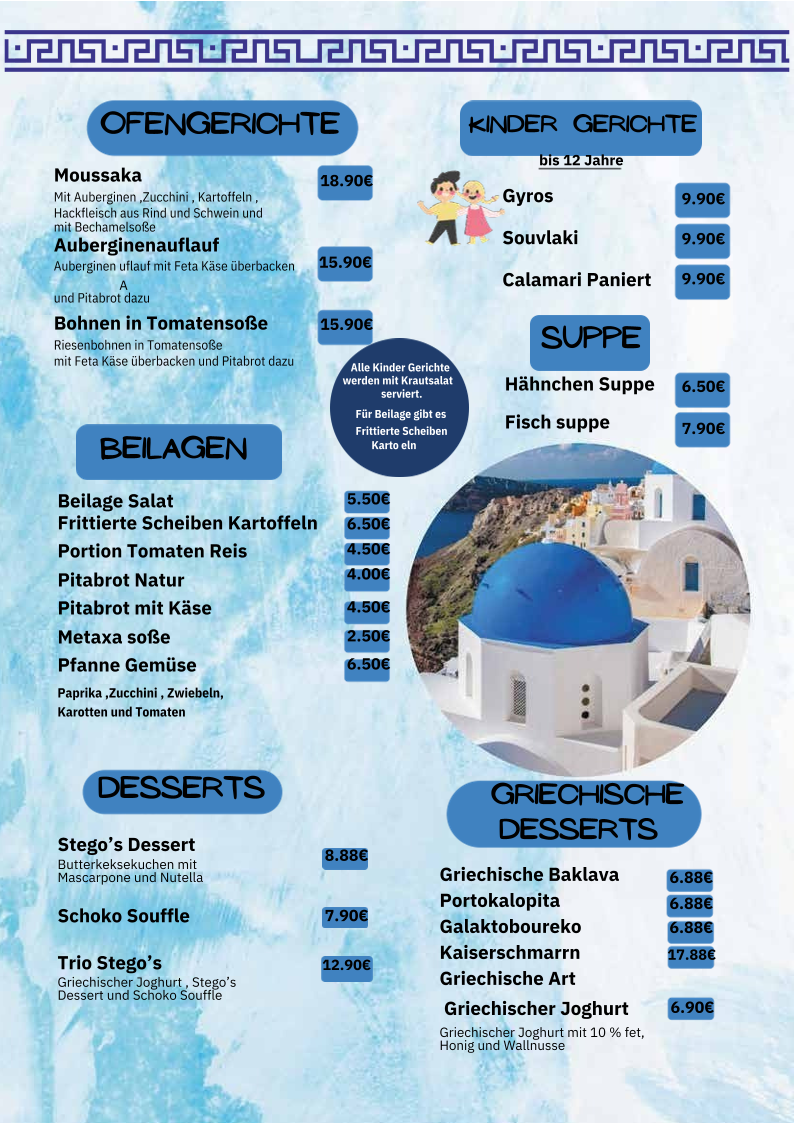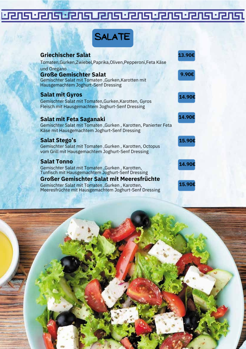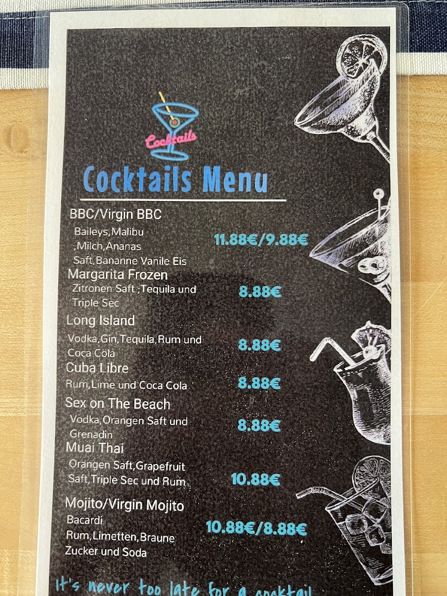 Overall, the menu at Griechische Restaurant Stego’S Füssen offers a satisfying and well-rounded glimpse into traditional Greek cuisine, with a variety of flavorful options across each category. The appetizers stand out with classics like Tzatziki, Garnelen Saganaki, and Oktopus vom Grill, as well as a generous Warme Vorspeise Platte ideal for sharing. Freshness continues in the salads, where choices such as Salat Stego’s, Salat mit Gyros, Salat mit Feta Saganaki, and the ever-popular Griechischer Salat provide lighter yet authentic alternatives. The main meat dishes are particularly appealing, featuring staples like Souvlaki, Bifteki, Gyros, and the richer Gyros mit Metaxa sauce, alongside Rinderleber vom Grill for those seeking something more distinctive. Seafood lovers are also well catered for, with options like Baby Calamari vom Grill, Lachsfilet vom Grill, and Miesmuscheln mit Tomaten Reis, all reflecting a Mediterranean touch. To complement the meal, the inclusion of cocktails such as the refreshing Mojito adds a modern twist. While specific prices are not listed, the selection itself suggests a menu designed to balance tradition, variety, and satisfying portions, leaving a positive final impression.